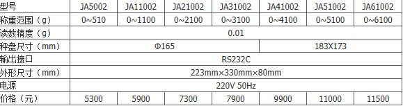 稱量:510(g) | 顯示值:0.01g | 規(guī)格:電子天平JA5002 |